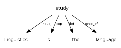 Dependency representation of "Linguistics is the study of language" (BNC sentence HH3 12894)